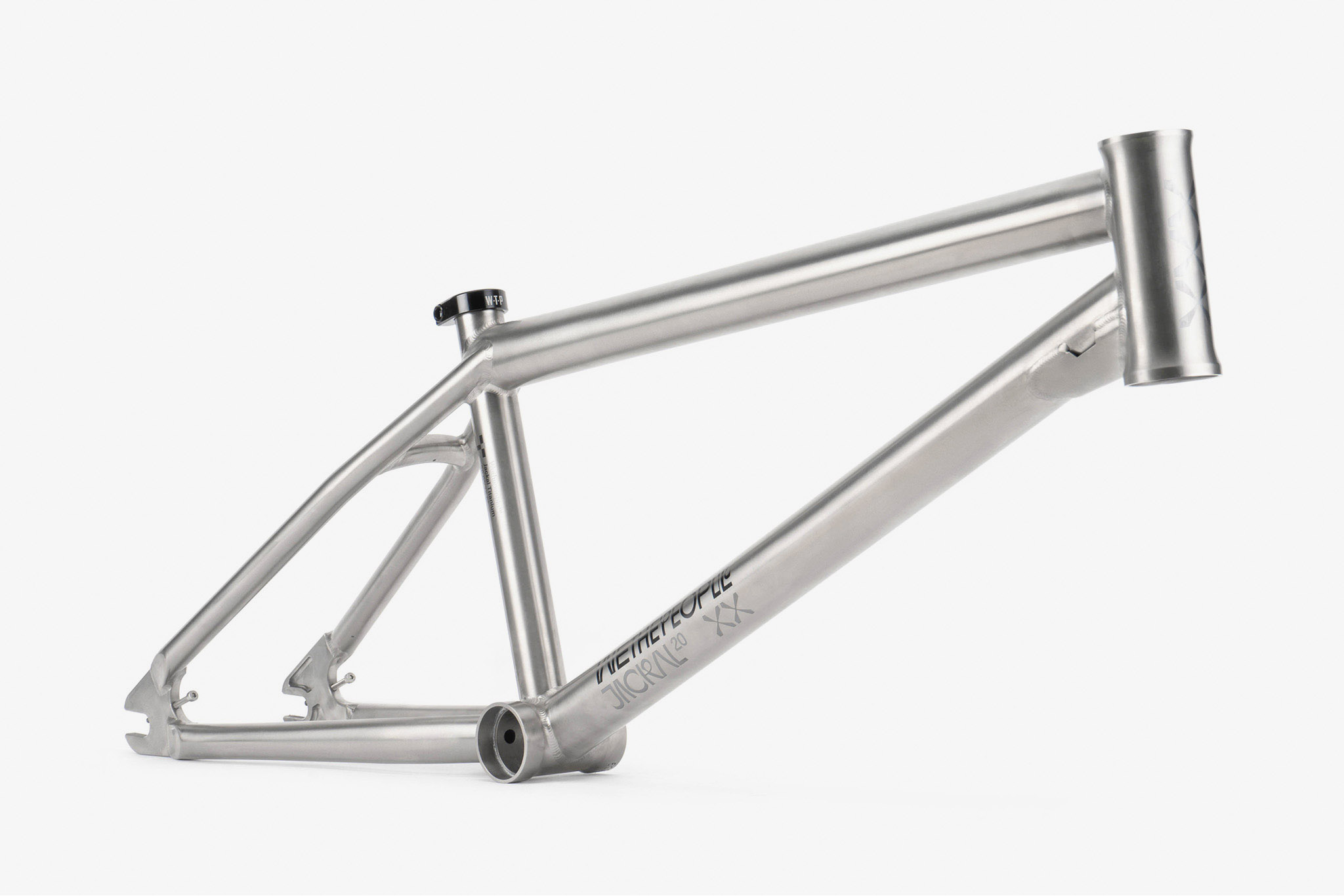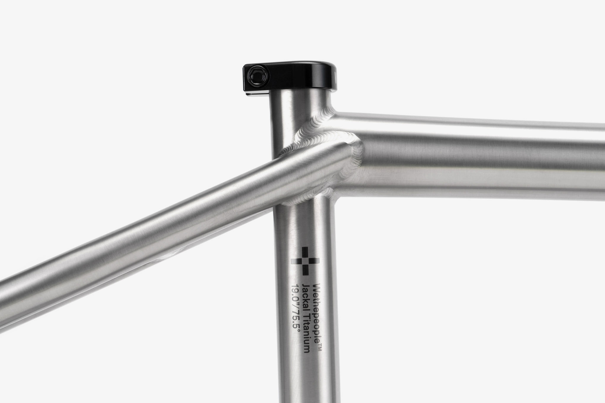 What started as a casual conversation with our flatland team riders about basic frame/fork geometry, later exploded into a two-year quest to create a super lightweight and modern flatland frame and fork fully built from Titanium alloy. Hand crafted by one of the highest quality Titanium fabricators in the industry, the Wethepeople Jackal Frame is a contemporary flatland frame built to shed as much weight as possible without adversely affecting the durability. With Titanium being a vastly different material to Chromoly, we decided to take a more methodical approach and learn exactly how to use the material safely and wisely allowing us to keep all the weight benefits without sacrificing the overall rigidity and feel of the frame. Our first ever Titanium frame (so this one had to be done right) will be built to incredibly high tolerances and quality standards. Whilst there may be marginally lighter titanium flatland frames on the market, the Jackal Frame is in our eyes a step above and beyond the normal application of this special material in BMX and caters to the benefits and special properties the material naturally offers. Up to 30% We decided to go with a more progressive, modern frame geometry borrowed from our Utopia Hybrid frame, with strength and stiffness being a priority. The first run of frames will be available in both a 19” toptube and a 20” toptube, with no brake mounts for the first batch. Up to 35% lighter than an equivalent chromoly frame, whether you’re looking to ride an incredibly light and durable hand made BMX frame or simply own a masterpiece of a bike, the Jackal Frame is something truly special.